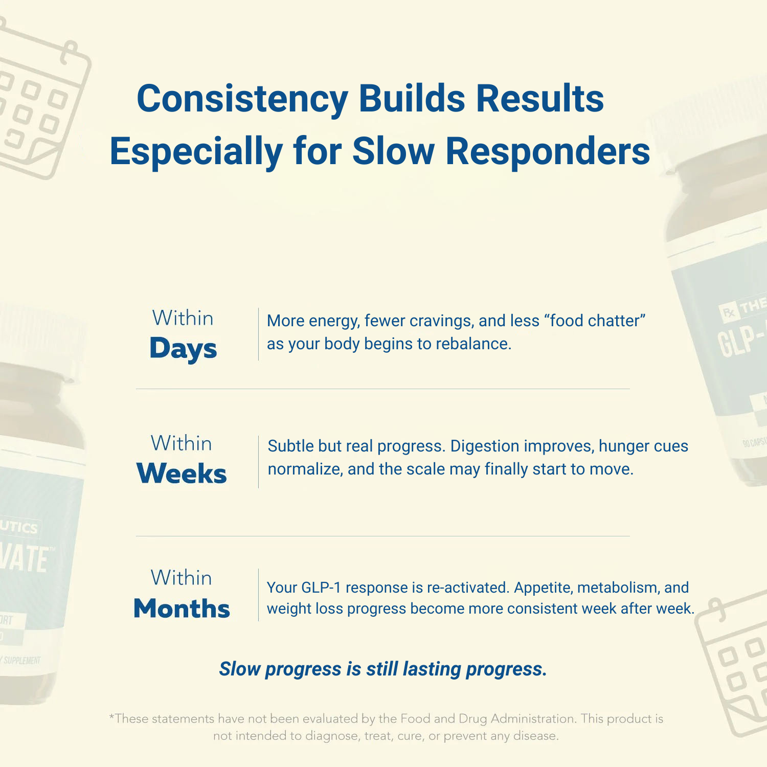 Many people who struggle to see results on GLP-1s are "slow responders" due to nutrient depletion, gut sluggishness, or reduced GLP-1 receptor sensitivity. GLP-Activate supports these natural pathways to help your body respond more effectively.